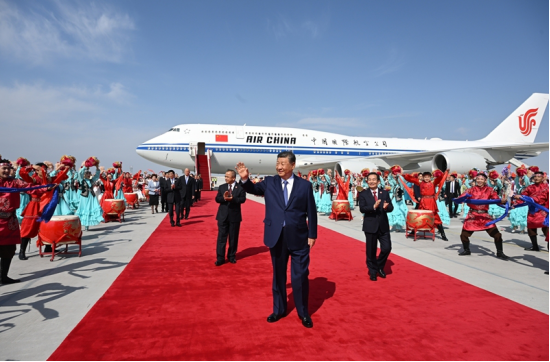 新疆维吾尔自治区党委书记陈小江、自治区人民政府主席艾尔肯·吐尼亚孜、自治区人大常委会主任祖木热提·吾布力、自治区政协主席努尔兰·阿不都满金、新疆生产建设兵团政委何忠友等在舷梯下迎候。习近平走下舷梯时,少先队员献上鲜花。各族群众代表身着民族服饰,载歌载舞,欢迎总书记的到来,表达对总书记的衷心祝福。