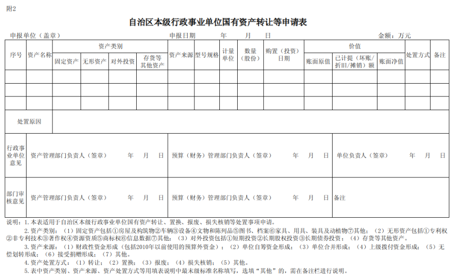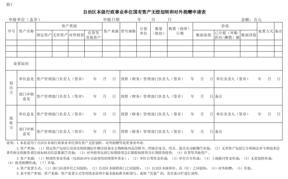 附:1.自治区本级行政事业单位国有资产无偿划转和对外捐赠申请表