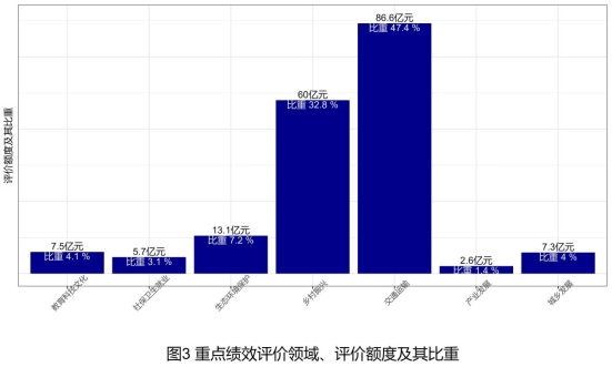 (二)自治区重点项目绩效评价。由自治区主管部门委托第三方机构完成绩效评价工作,共计57个项目,涉及资金182.8亿元,主要涉及交通和乡村振兴领域,占比高达80%。(详见表3和图3)