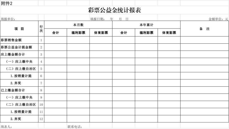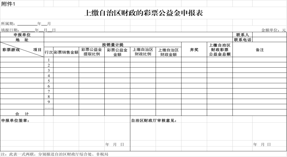 (一)自治区彩票销售机构于每月5日前向自治区财政厅报送《上缴自治区财政的彩票公益金申报表》(见附件1)及相关材料,申报上月彩票销售金额和应上缴自治区财政的彩票公益金金额;